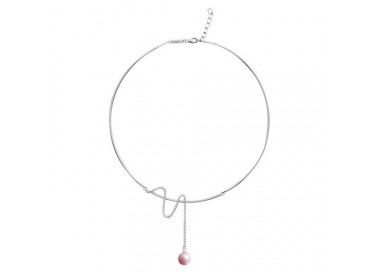 Elsa Lee Paris - Collier jonc en argent 925 rhodié, pendentif en forme d'ondulation, une perle rose de 10 mm et 66 oxydes de zirconium 1,07 ct sertis