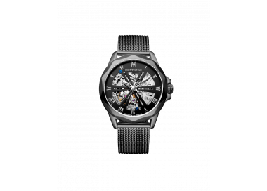 Dessinée et assemblée en France, la montre pour homme MOW1005 présente un cadran noir en forme d'étoile, laissant apercevoir les rouages d'un authentique mouvement automatique ainsi que des chiffres romains, dans les tons argenté. Ce modèle se compose d'un bracelet en mailles milanaises noir.